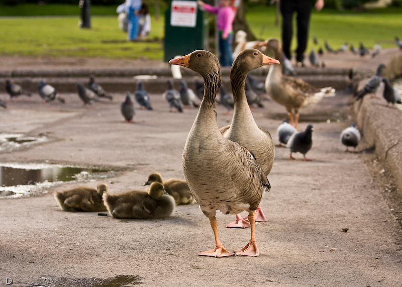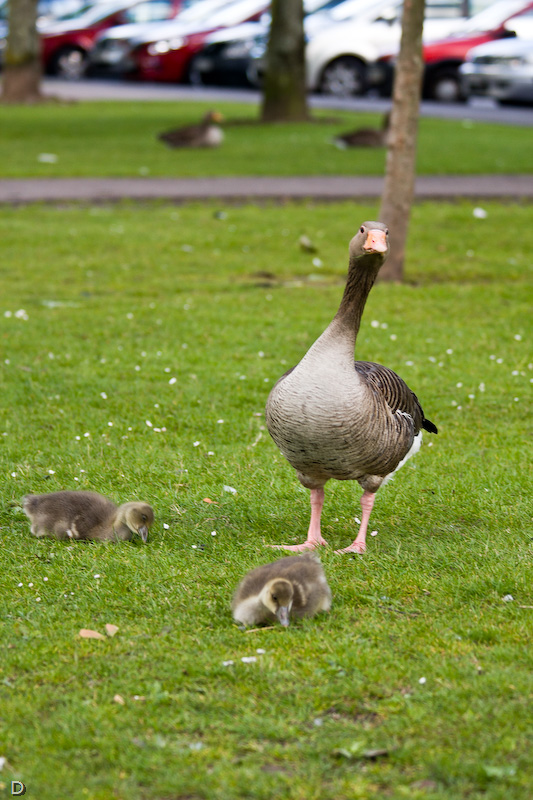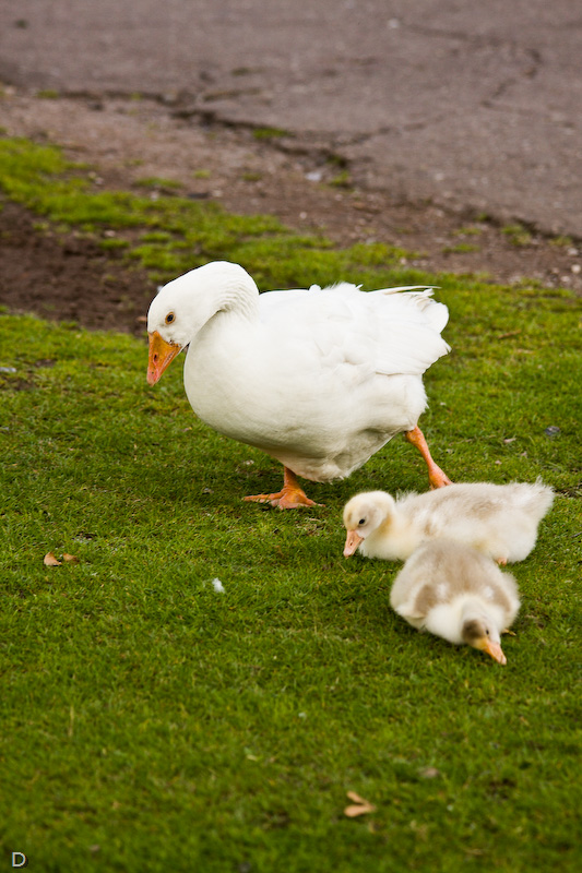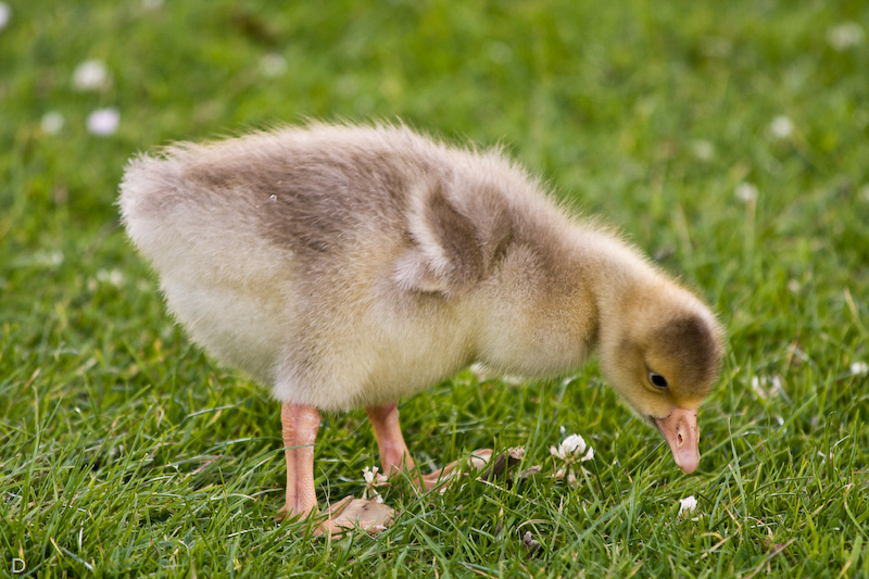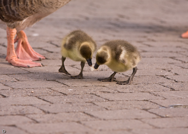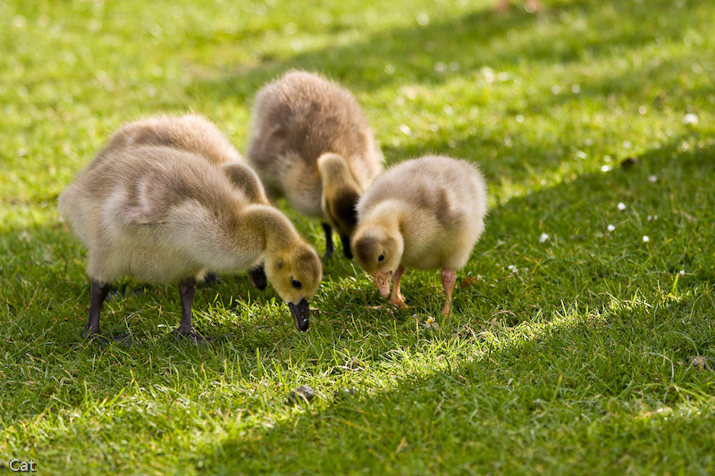 Мелкие гусята массово норовят плюхнуться и лопать сидя.